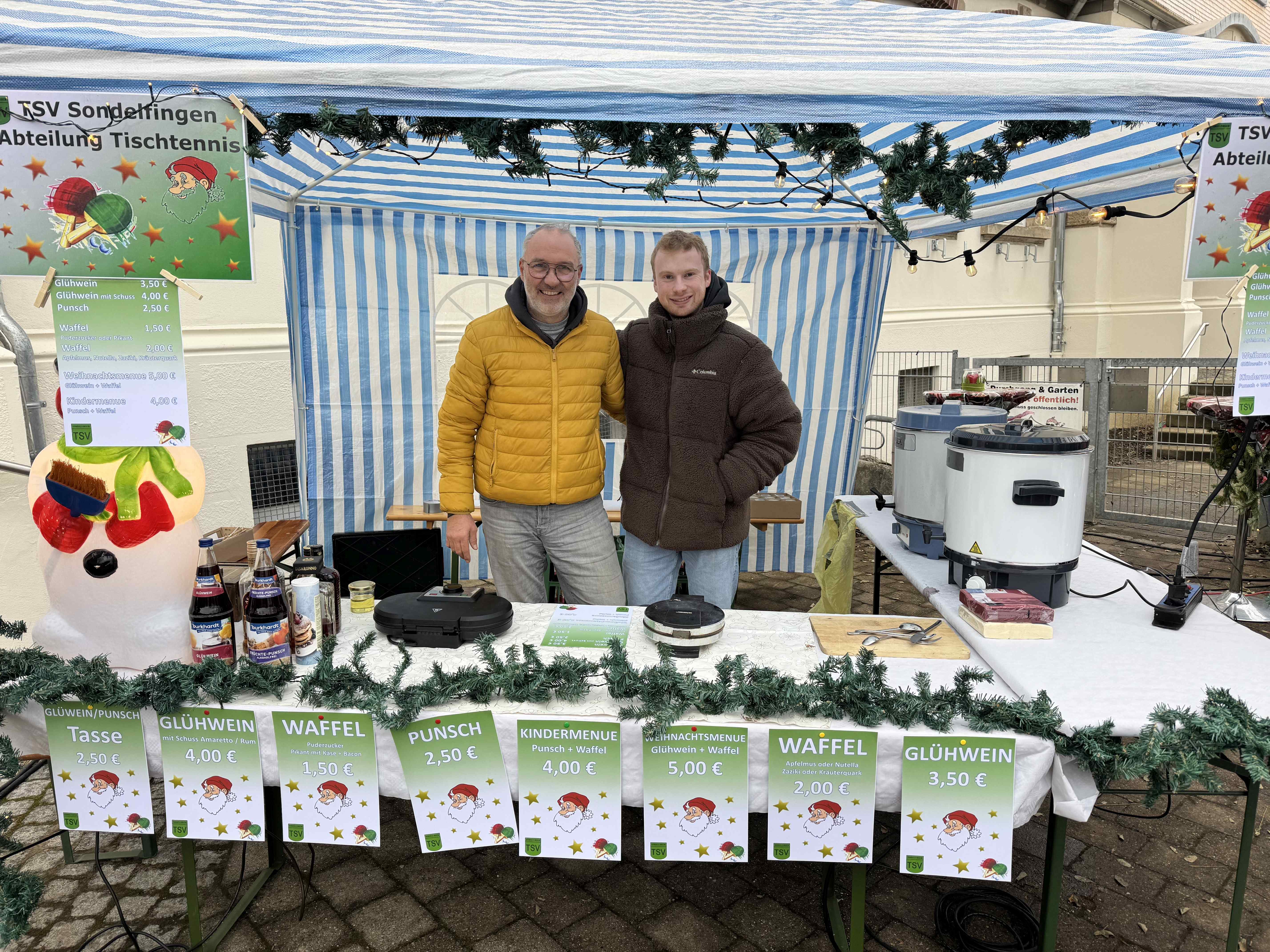 Die Tischtennisabteilung des TSV hatte dieses Jahr Premiere auf dem Sondelfinger Weihnachtsmarkt. Der angebotene Glühwein / Punsch sowie die sehr leckeren Waffeln süß und herzhaft fanden reisenden Absatz bei dieser sehr schönen lokalen Veranstaltung.